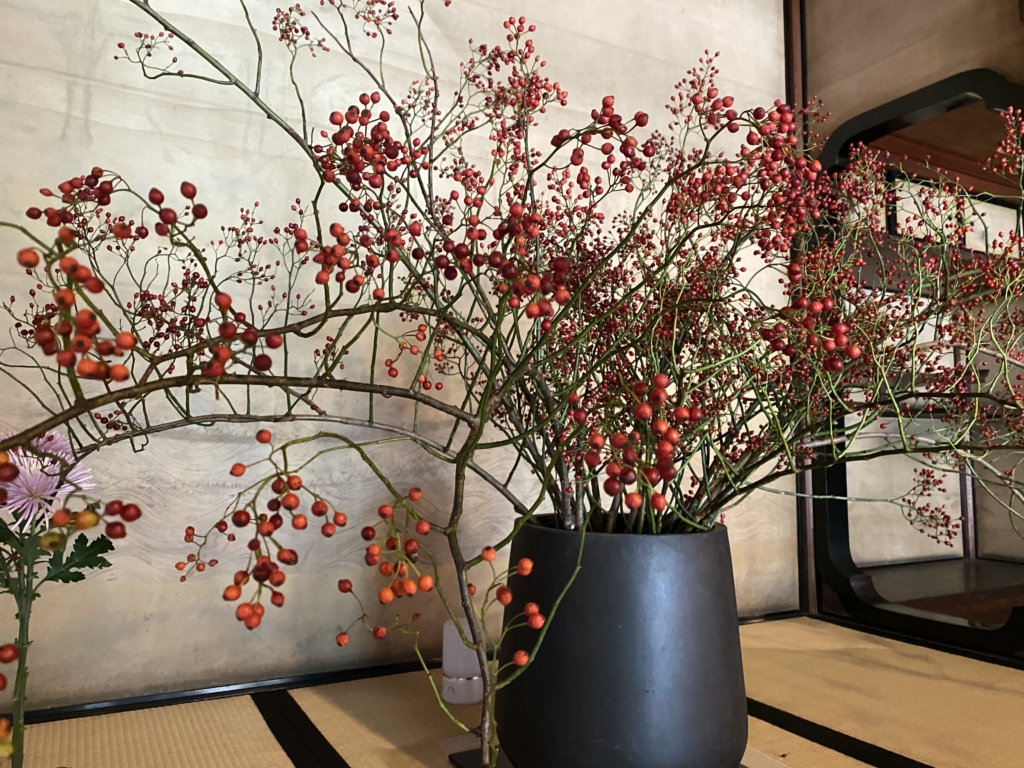 「最初に和館の広間はシンプルにしたくて一種活けを決めたんです。紅葉の枝では一週間鮮度を保つことは難しいので、野バラの枝を選びました。ほかの4つの作品は広間へとつなげていくアプローチとして、どこかに野バラを使っています」