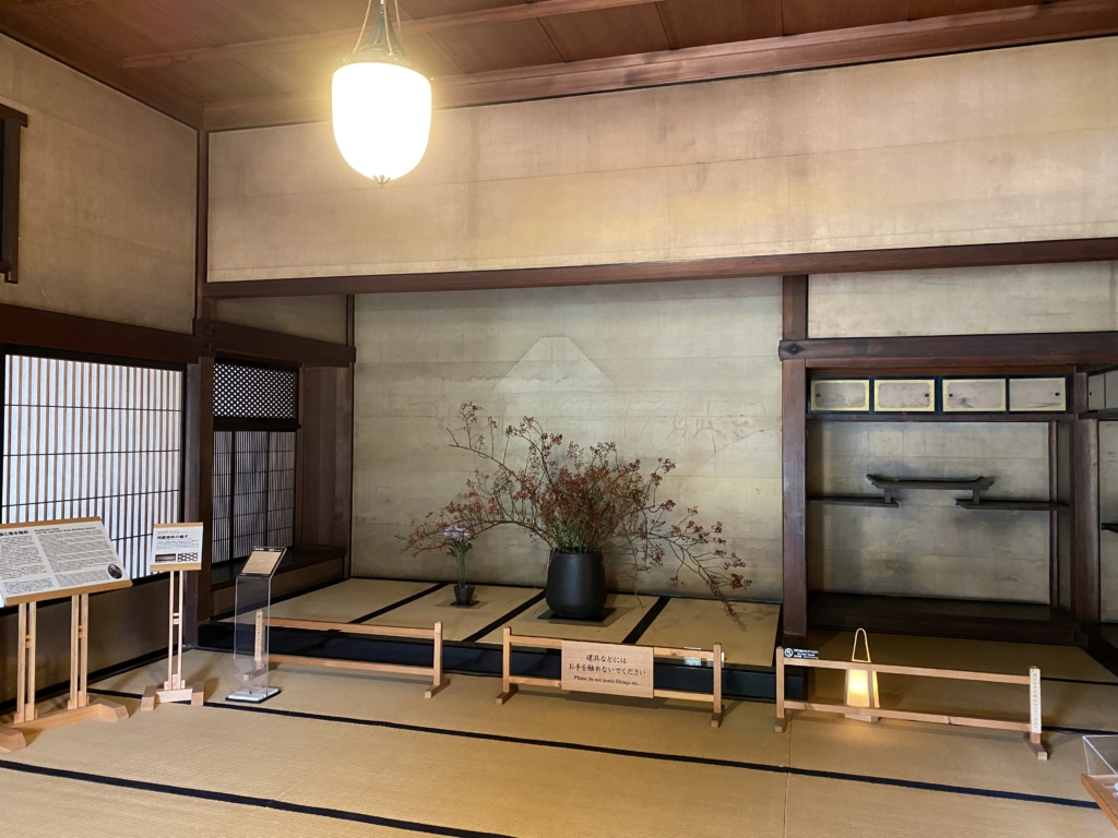 ハイライトは和室のアレンジメントです。見学コースの最期にある和館の広間に入ると、野バラの赤い実を存分に使った優雅な作品が目に飛び込んできました。見事の一言です。旧岩崎邸はイギリス人建築家が手がけた建築物なので、和館があることはあまり知られていませんが、このいかにも和風な空間に、どっしりと構えるアレンジメントが、郷愁の気持ちを誘うというか、やっぱりと心を落ち着かせるというか。わびさびという言葉を使えばおさまりは良いのでしょうが、その言葉でまとめたくないような、気持ちにさせられました。